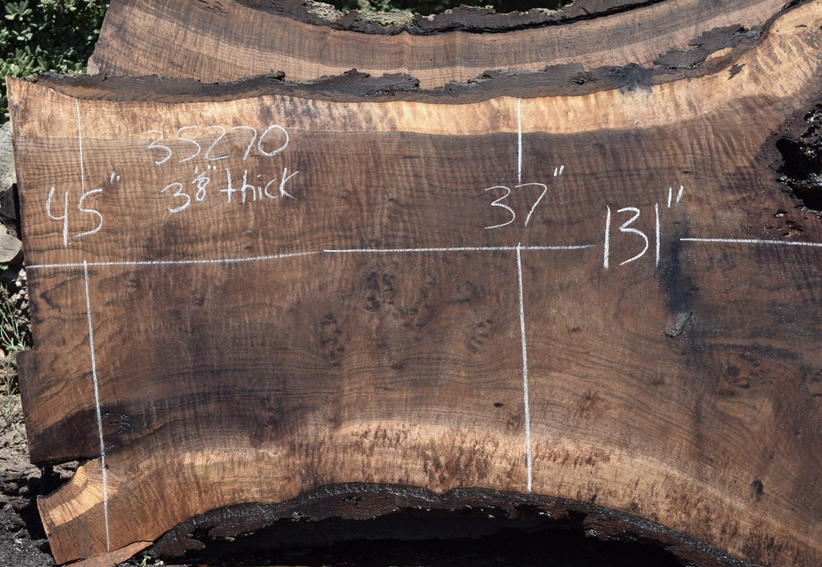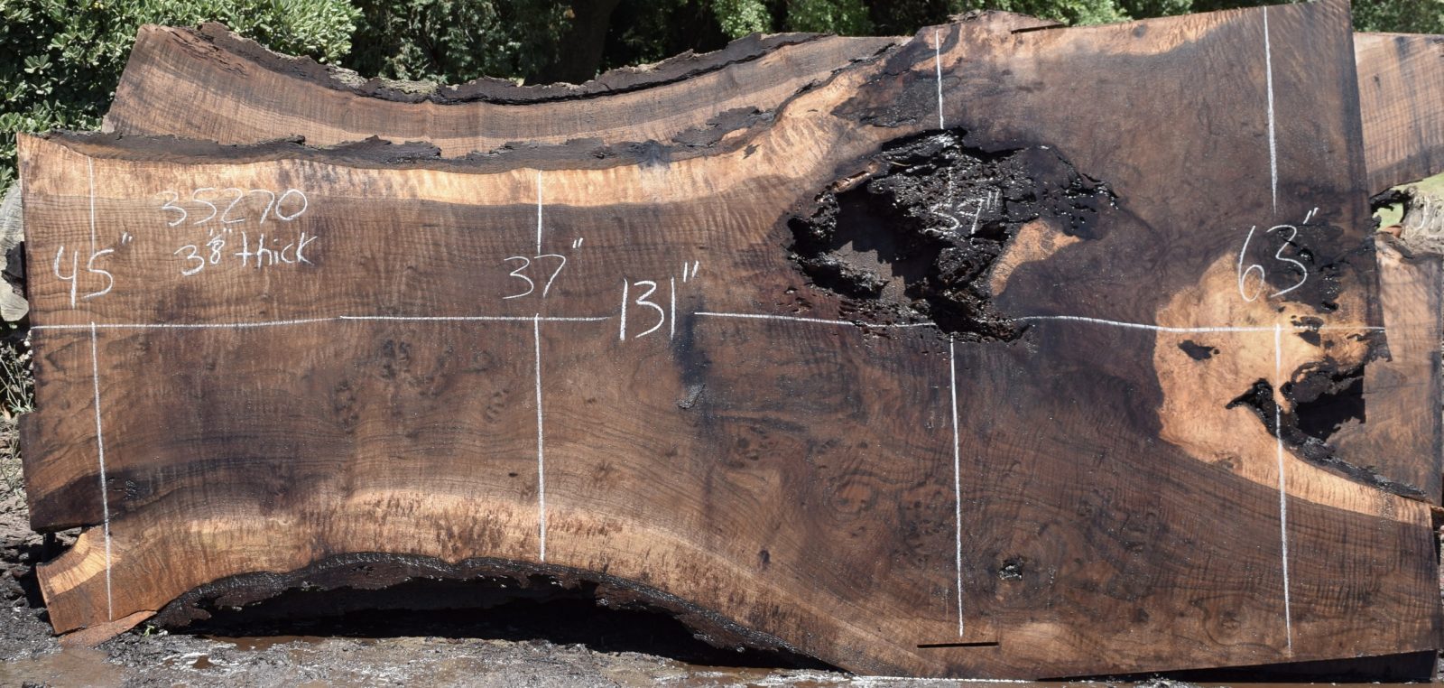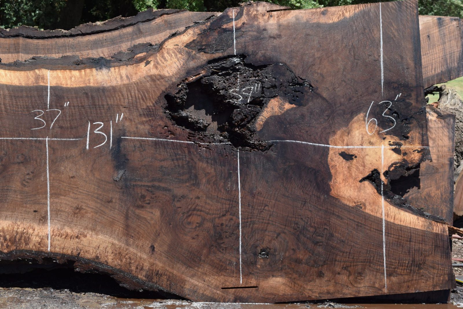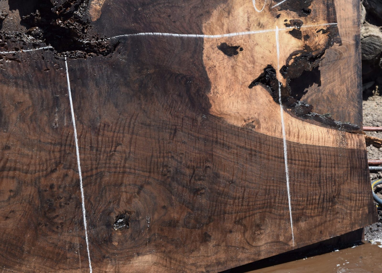 This is a beautiful highly figured Claro Walnut slab that has great color, figure and character. You can see us salvaging the tree here. Milled and air drying since July 2019.