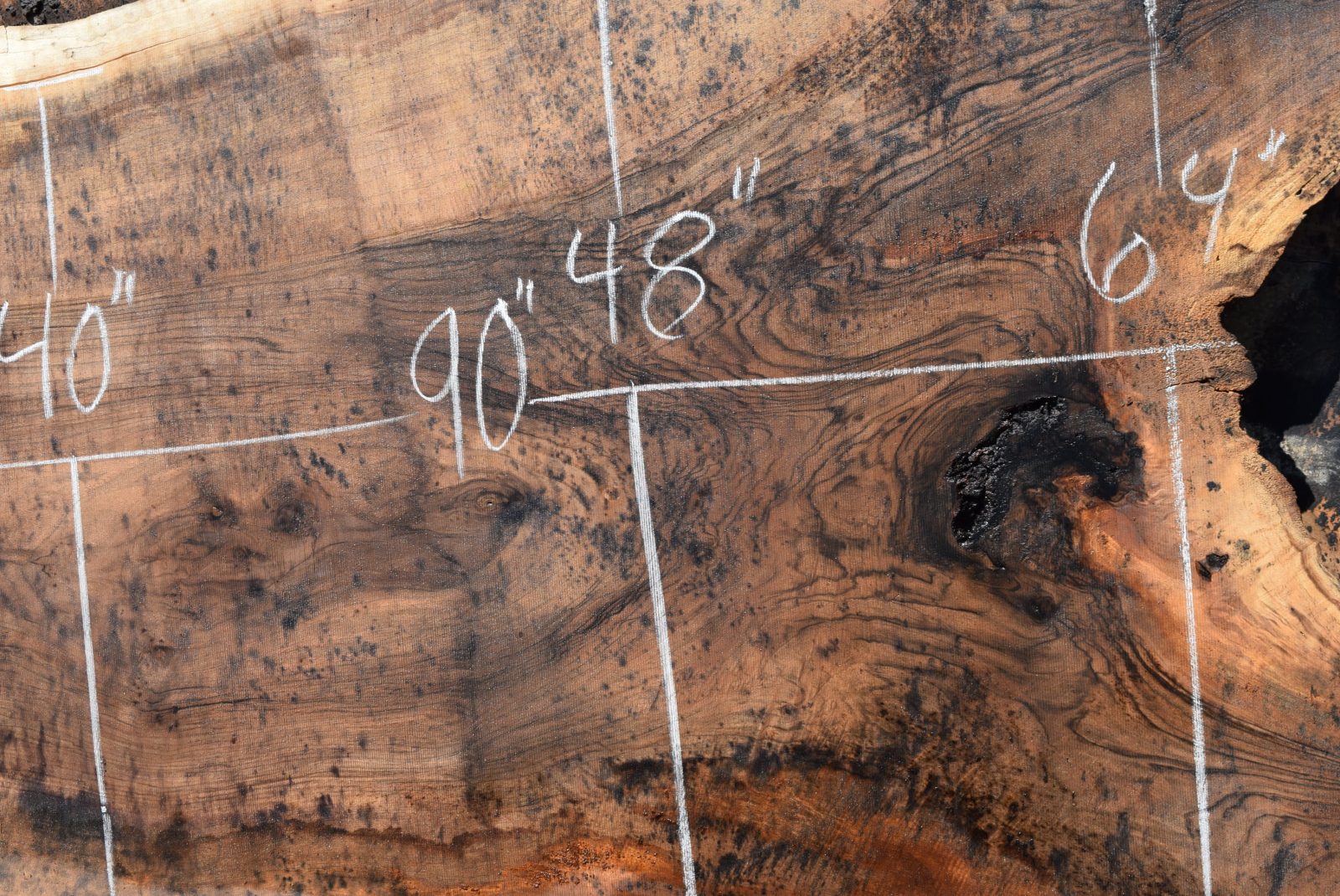 This is a beautiful grafted English/Bastogne Walnut slab that has good color and grain along with some light cracks. The slab came from a tree out of an orchard that we salvaged in Meridian, Ca. Milled and air drying since August 2019.