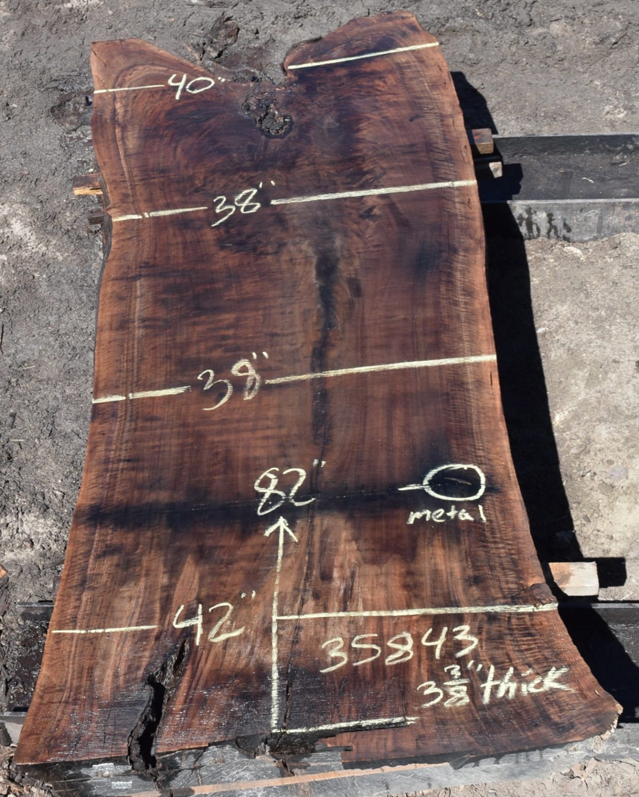 Nice color, grain and character along with some checks. Milled and air drying since July 2022 and should take roughly 8 weeks in the kiln to finish drying.