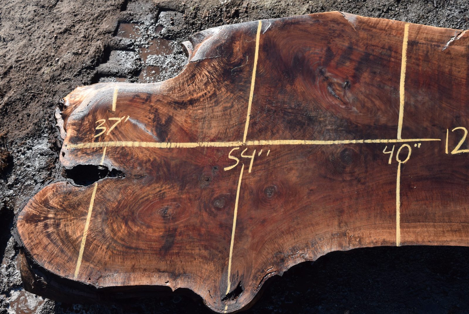35543 Figured Claro Walnut Slab 125”x54”-36”x 3 3/8” Feb 2022