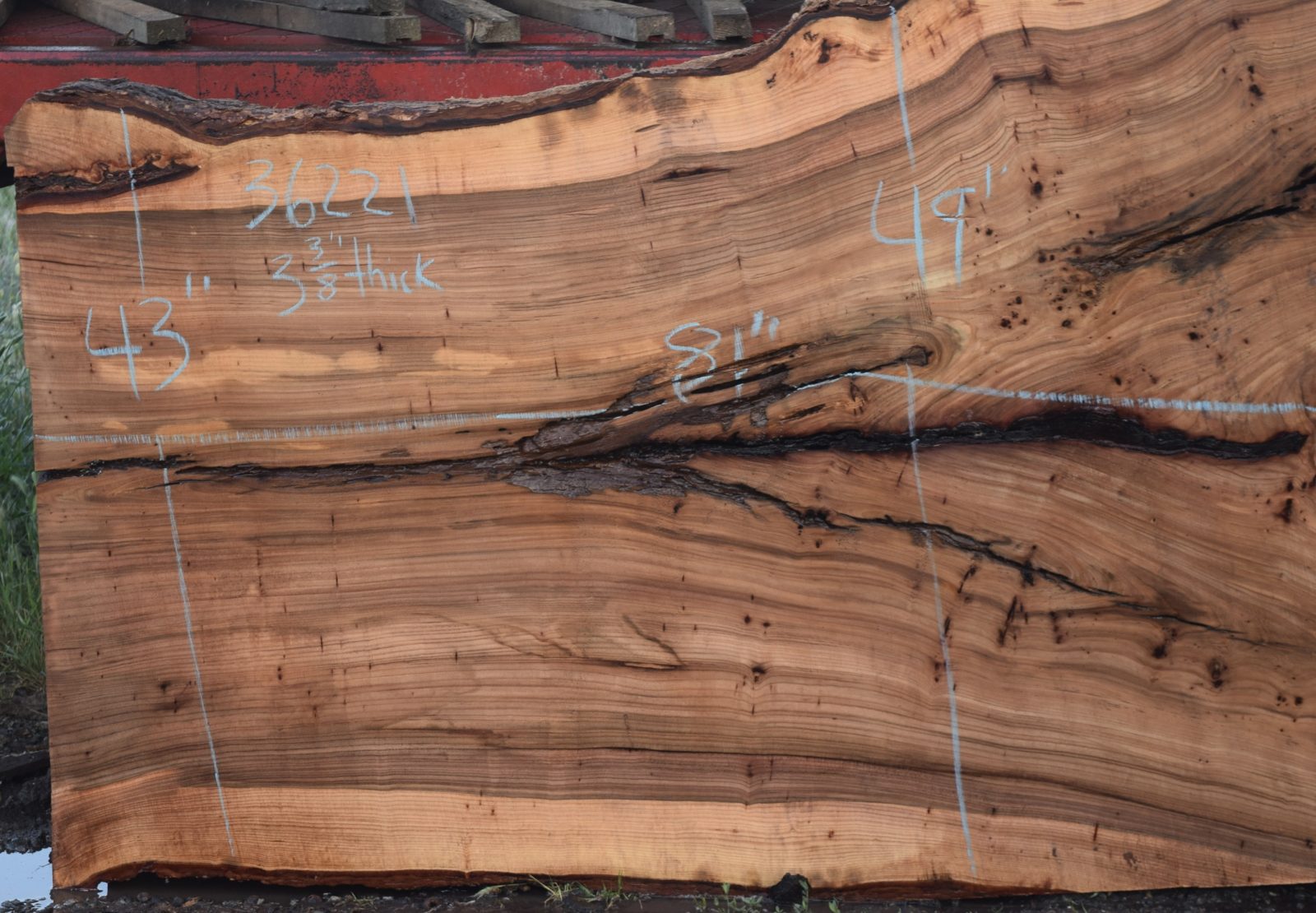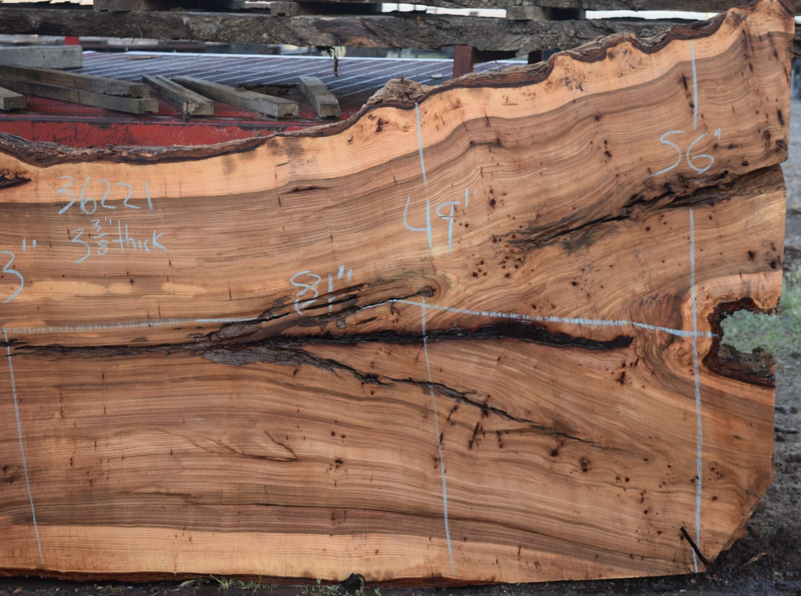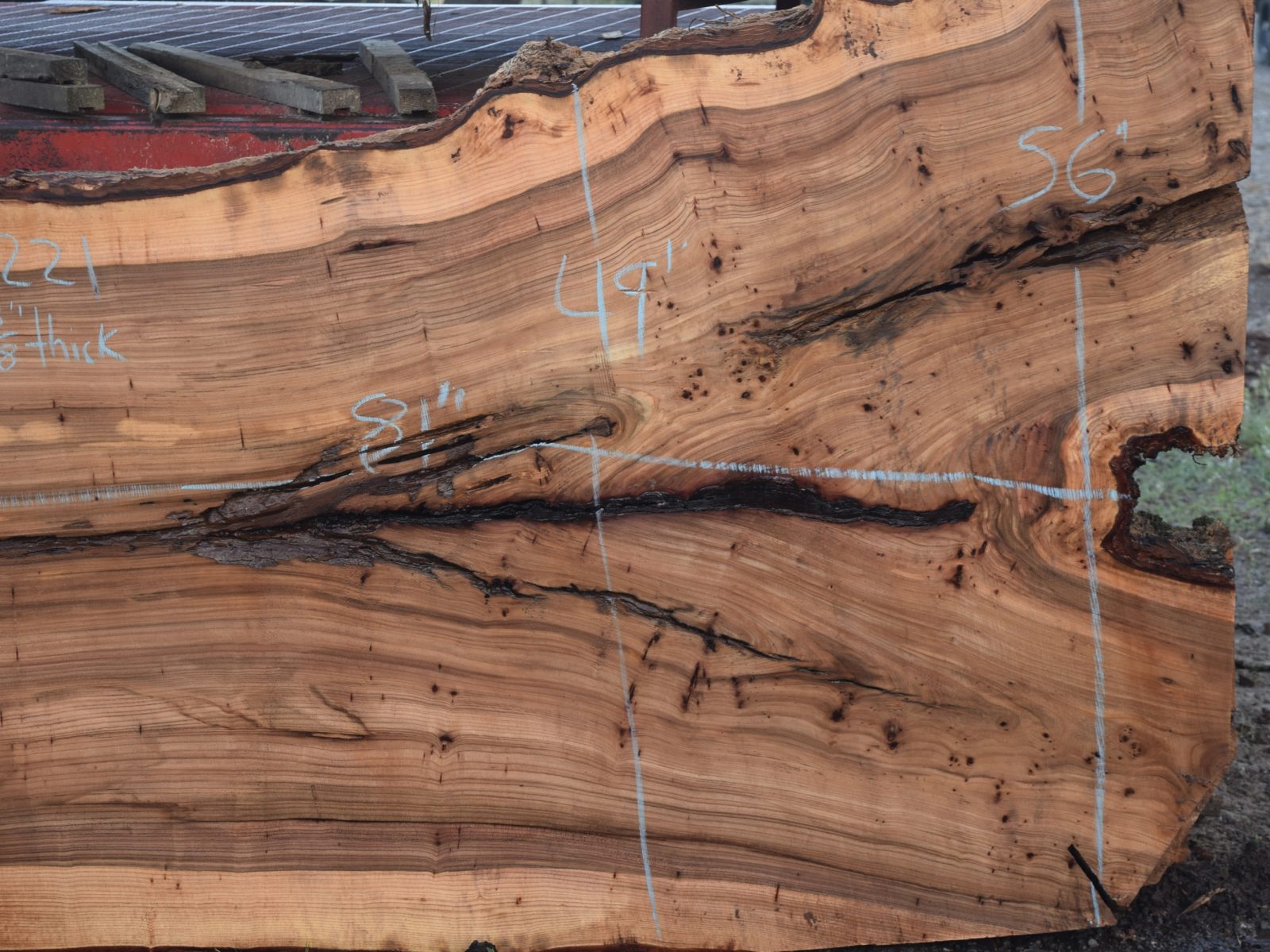 Milled and air drying since April 2025. Salvaged from a local Sacramento home. Nice color and grain along with some cracks and inclusions.